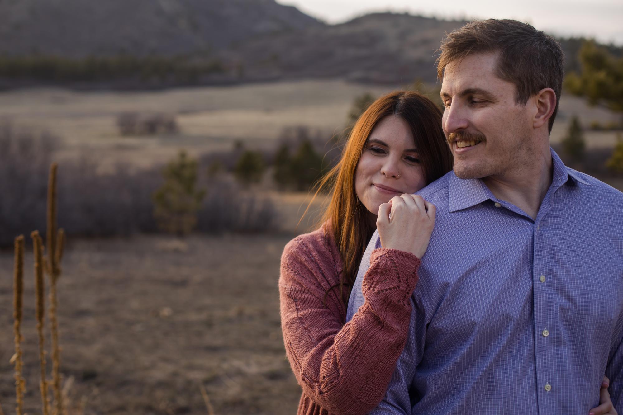 For their session, I found two locations that I thought would be perfect for them. Since they are so close together, we got to go to both in one session. We started their Colorado engagement session at Columbine Open Space, which has a gorgeous barn as well as beautiful open skies and fields. Then we went to Dawson Butte Open Space, which offered us some forest and mountain views! I love when two great locations are close and we have time to split the session between them to get two different looks. These two spots are only a couple of minutes away from each other!