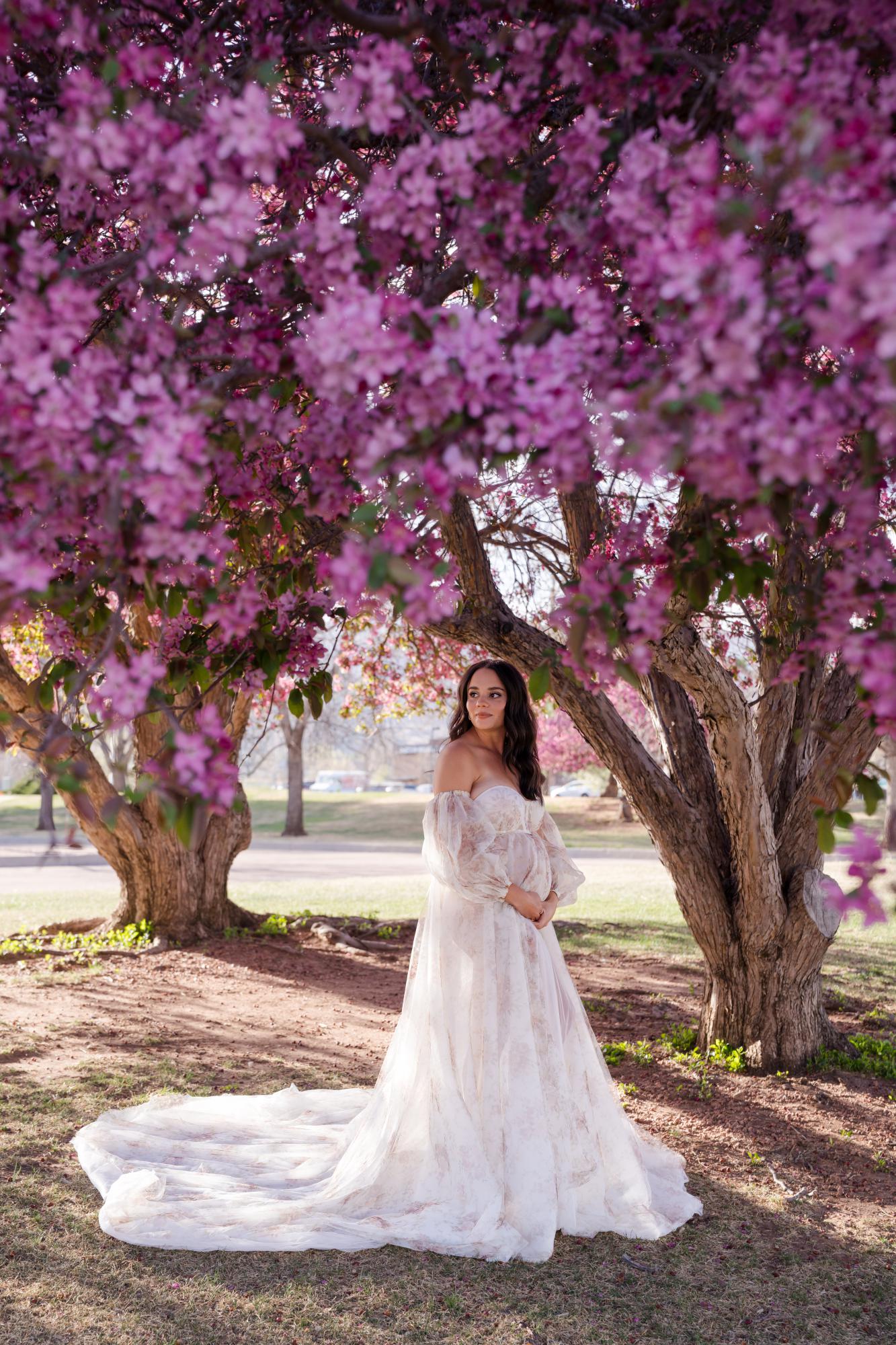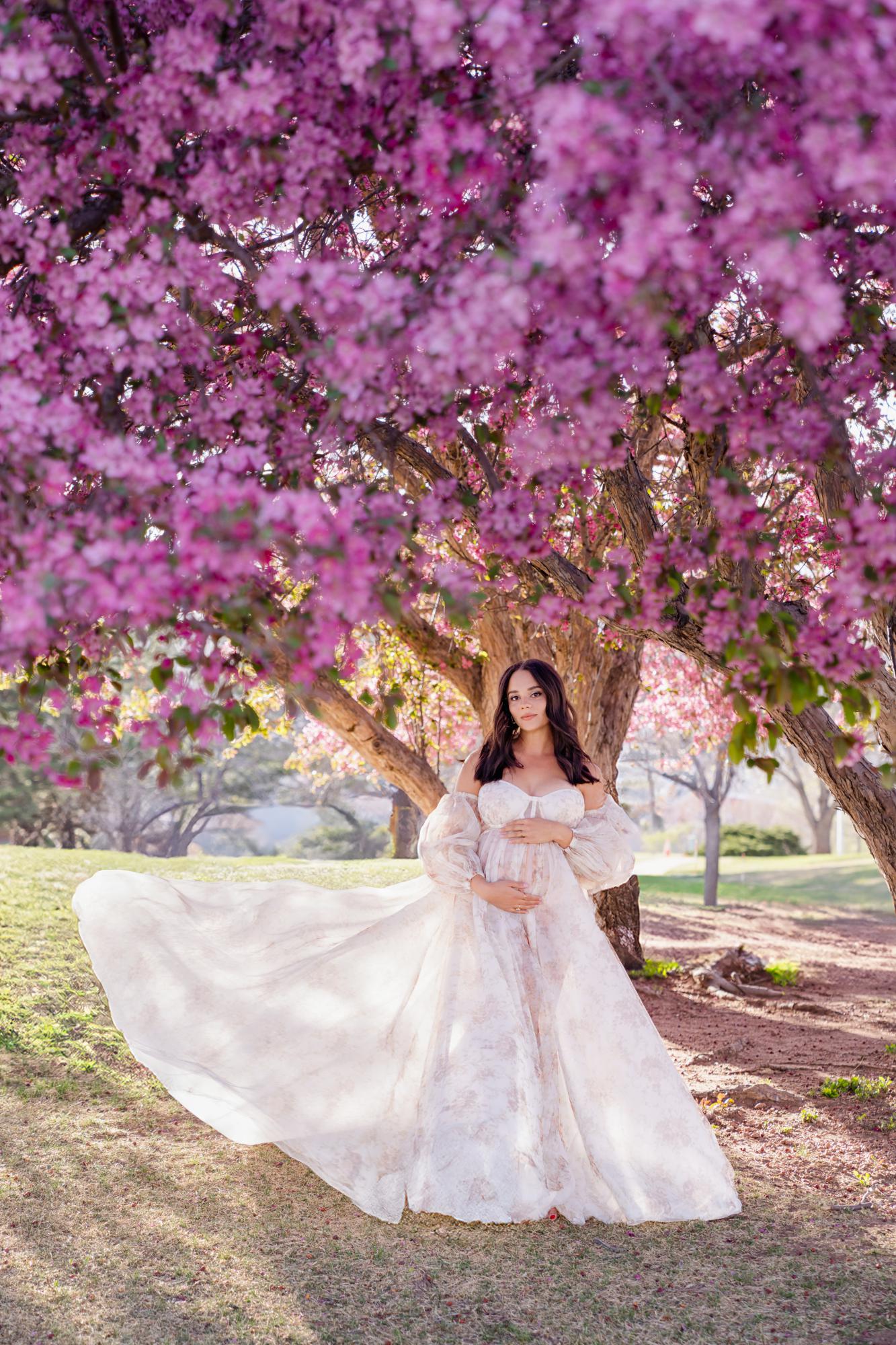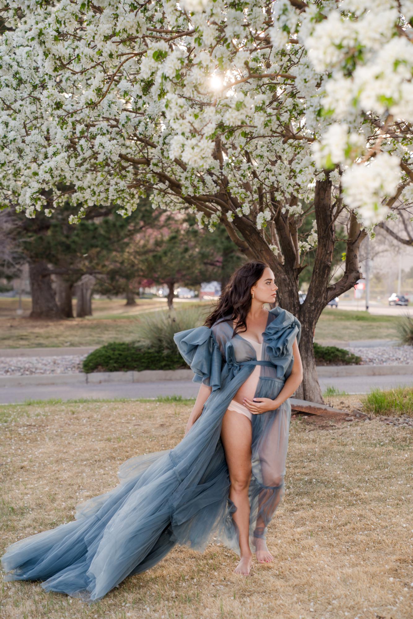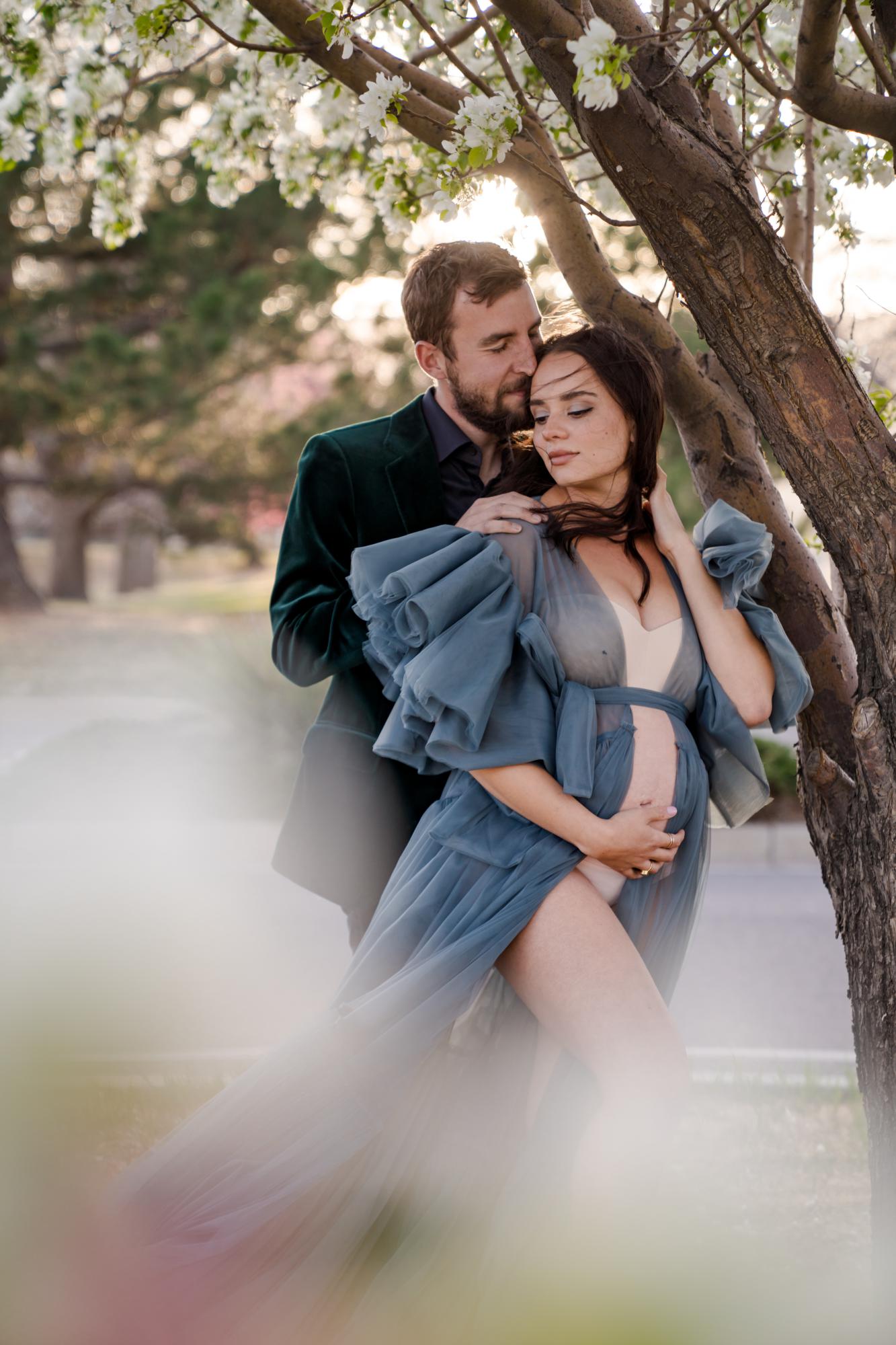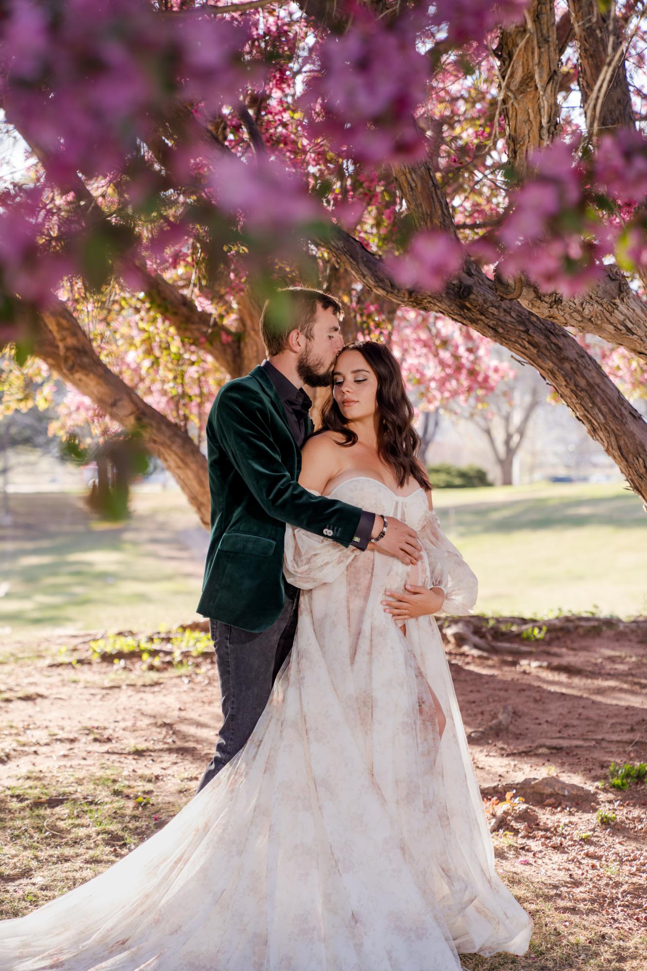 Spring (March–May) is known for delicate blossoms around town. While many people call them cherry blossoms, they are typically crabapple trees in our area. These blooms range from white to soft pink to deeper, vibrant pink tones. They’re usually found in landscaped areas within town rather than growing naturally in the Colorado wilderness. Spring maternity photography in Colorado Springs offers a soft, romantic backdrop with fresh greenery and mild temperatures. The session below is a perfect example of a spring blossom maternity session.
