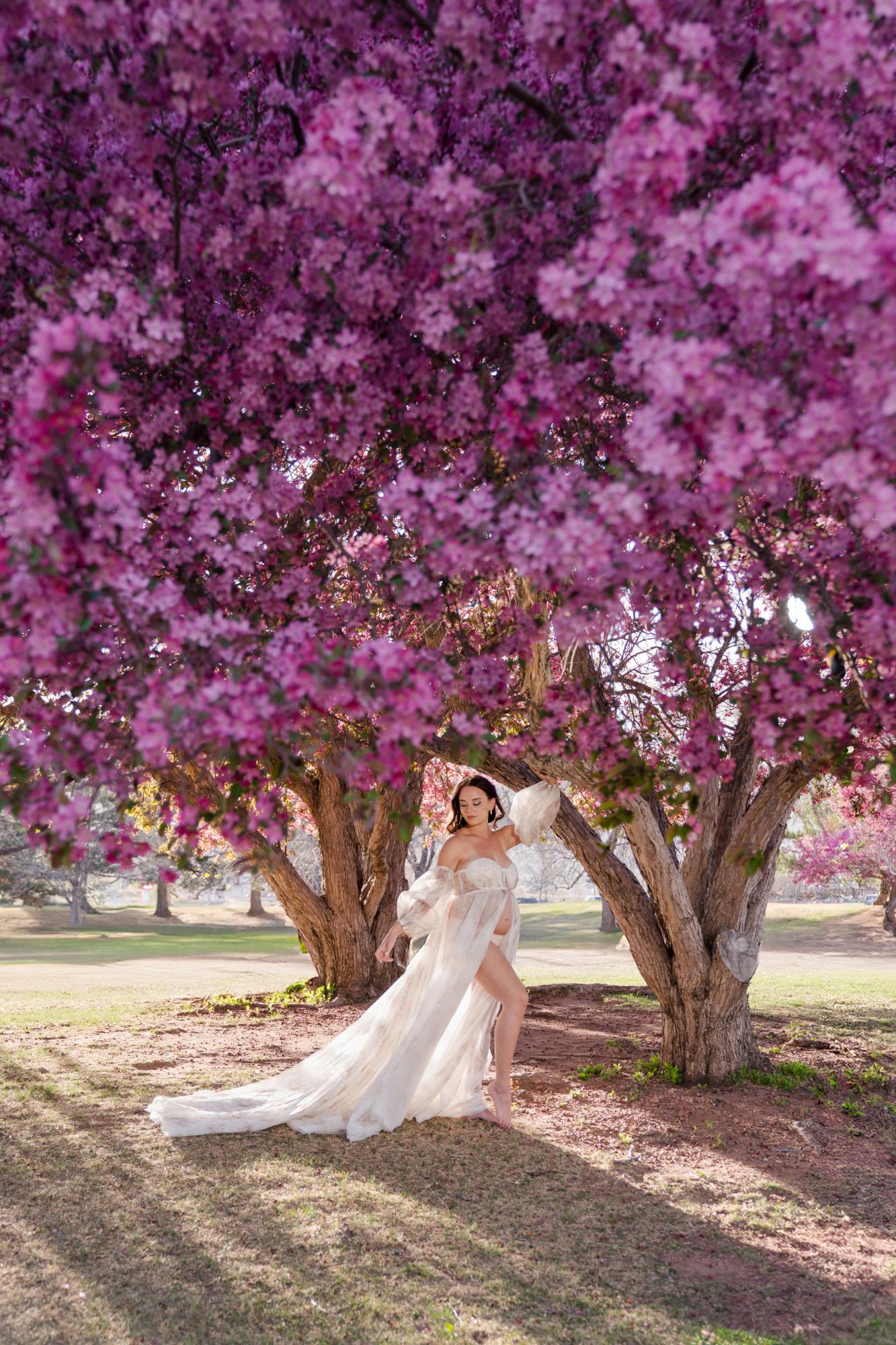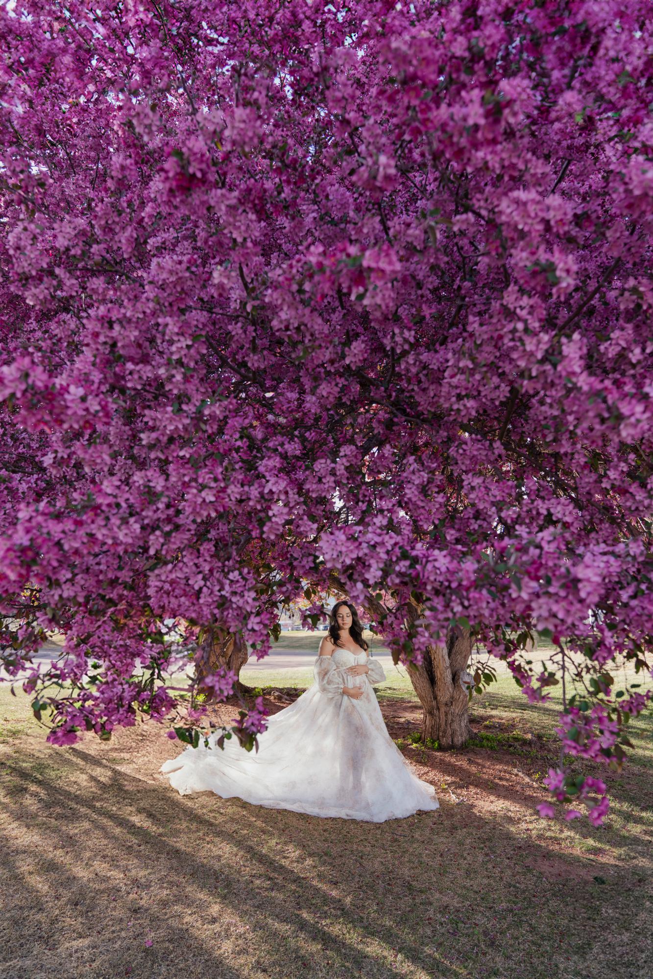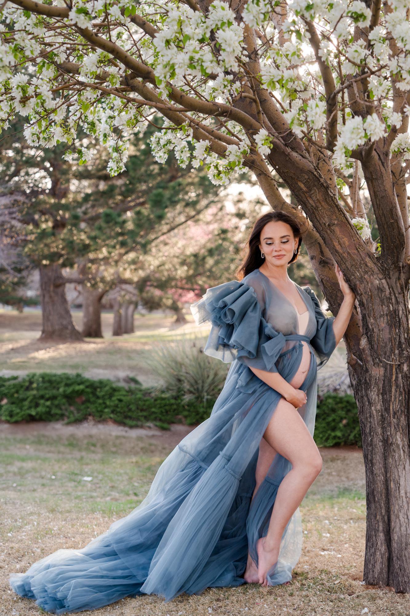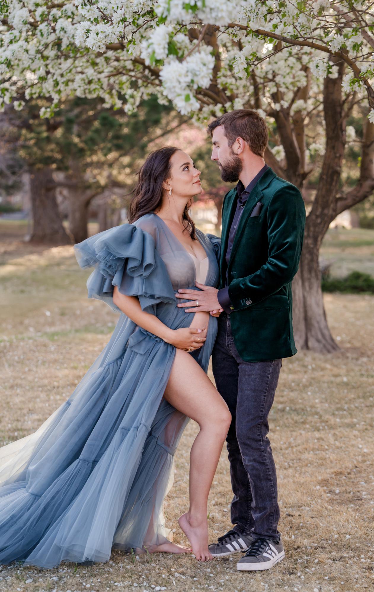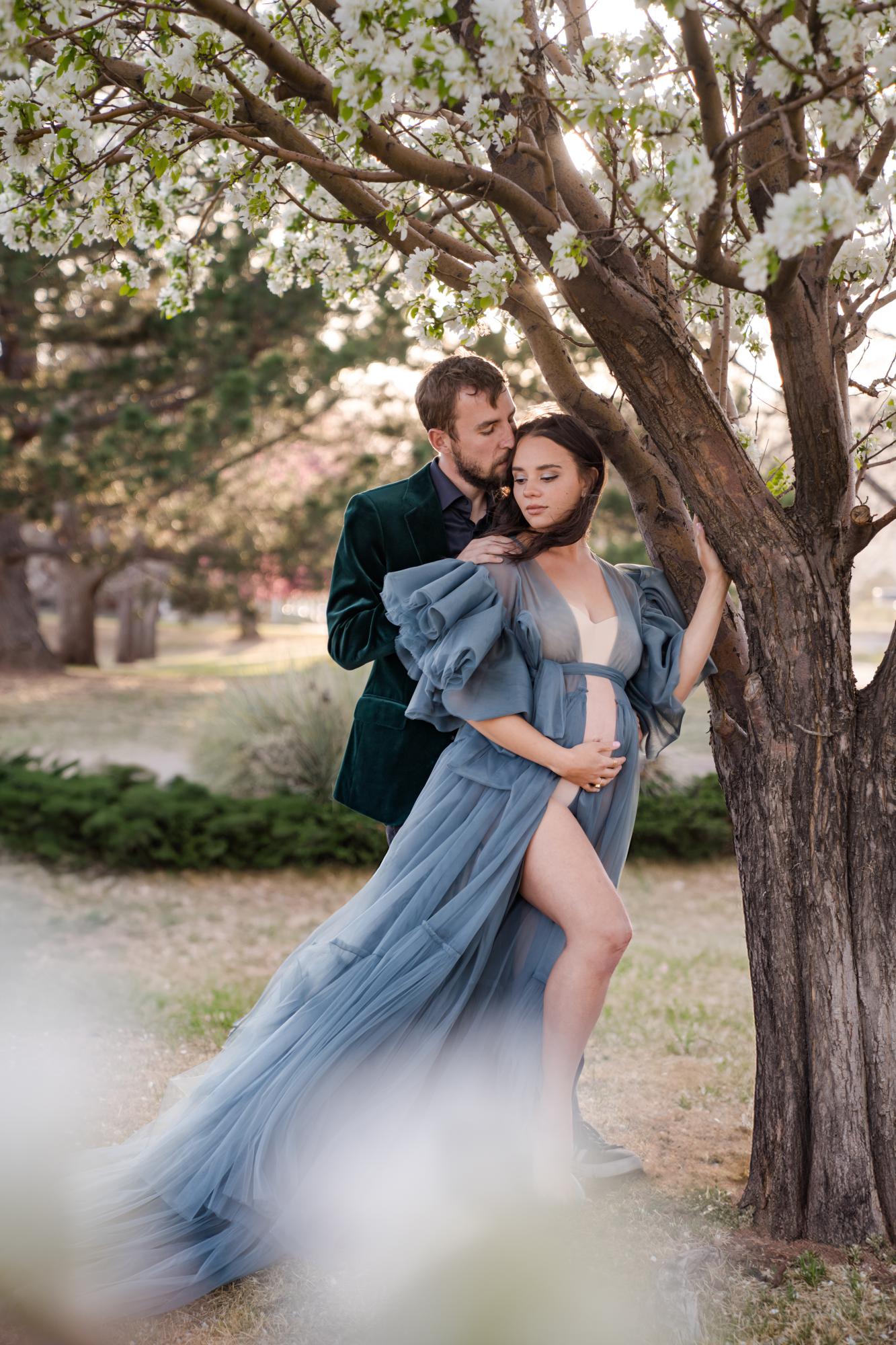 Spring (March–May) is known for delicate blossoms around town. While many people call them cherry blossoms, they are typically crabapple trees in our area. These blooms range from white to soft pink to deeper, vibrant pink tones. They’re usually found in landscaped areas within town rather than growing naturally in the Colorado wilderness. Spring maternity photography in Colorado Springs offers a soft, romantic backdrop with fresh greenery and mild temperatures. The session below is a perfect example of a spring blossom maternity session.