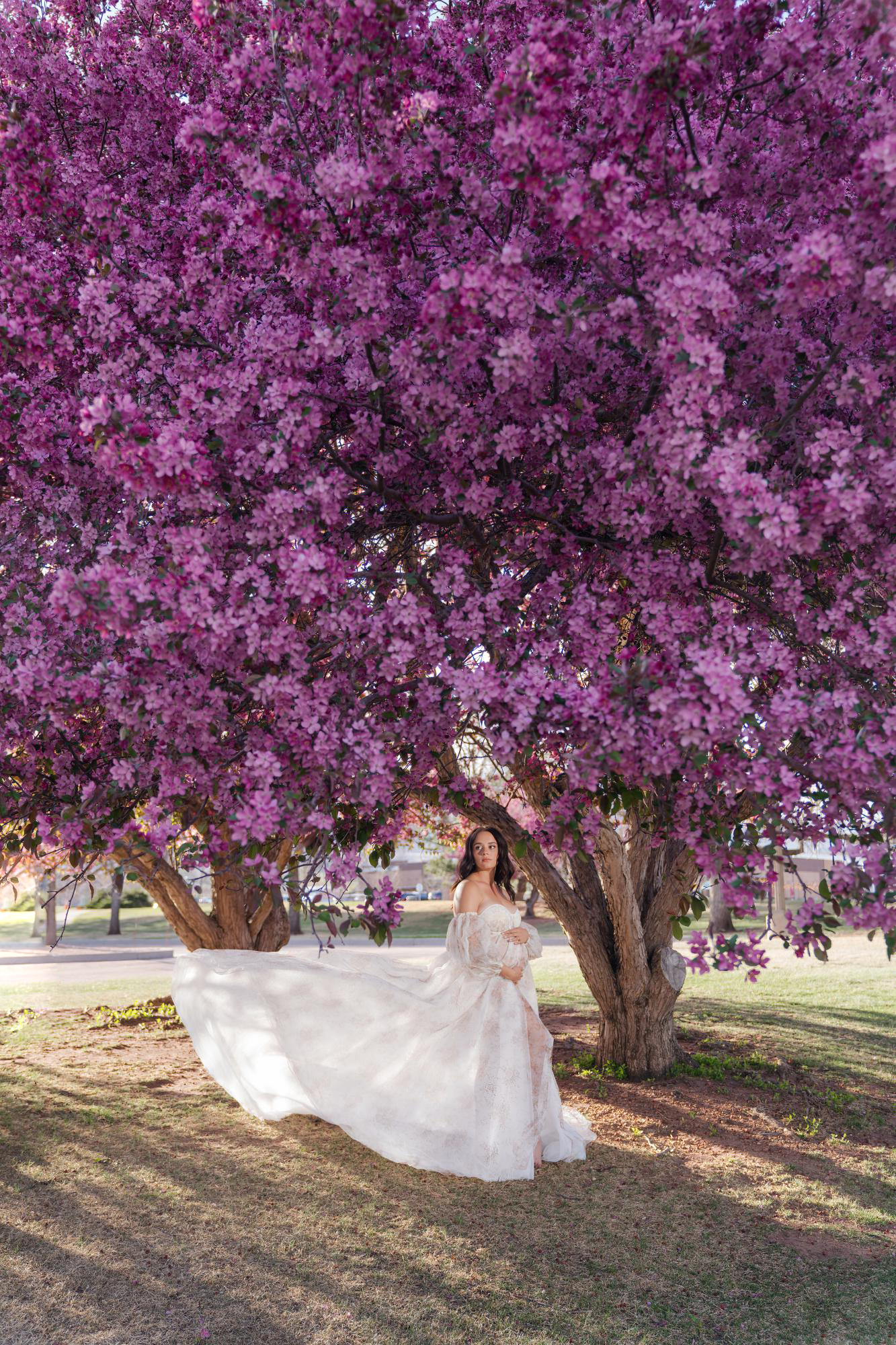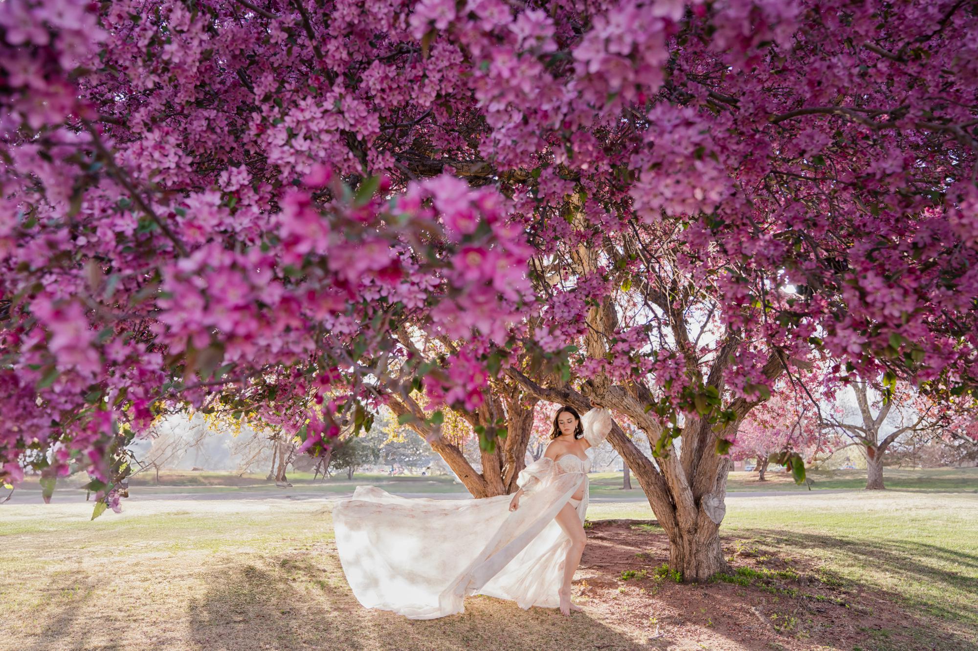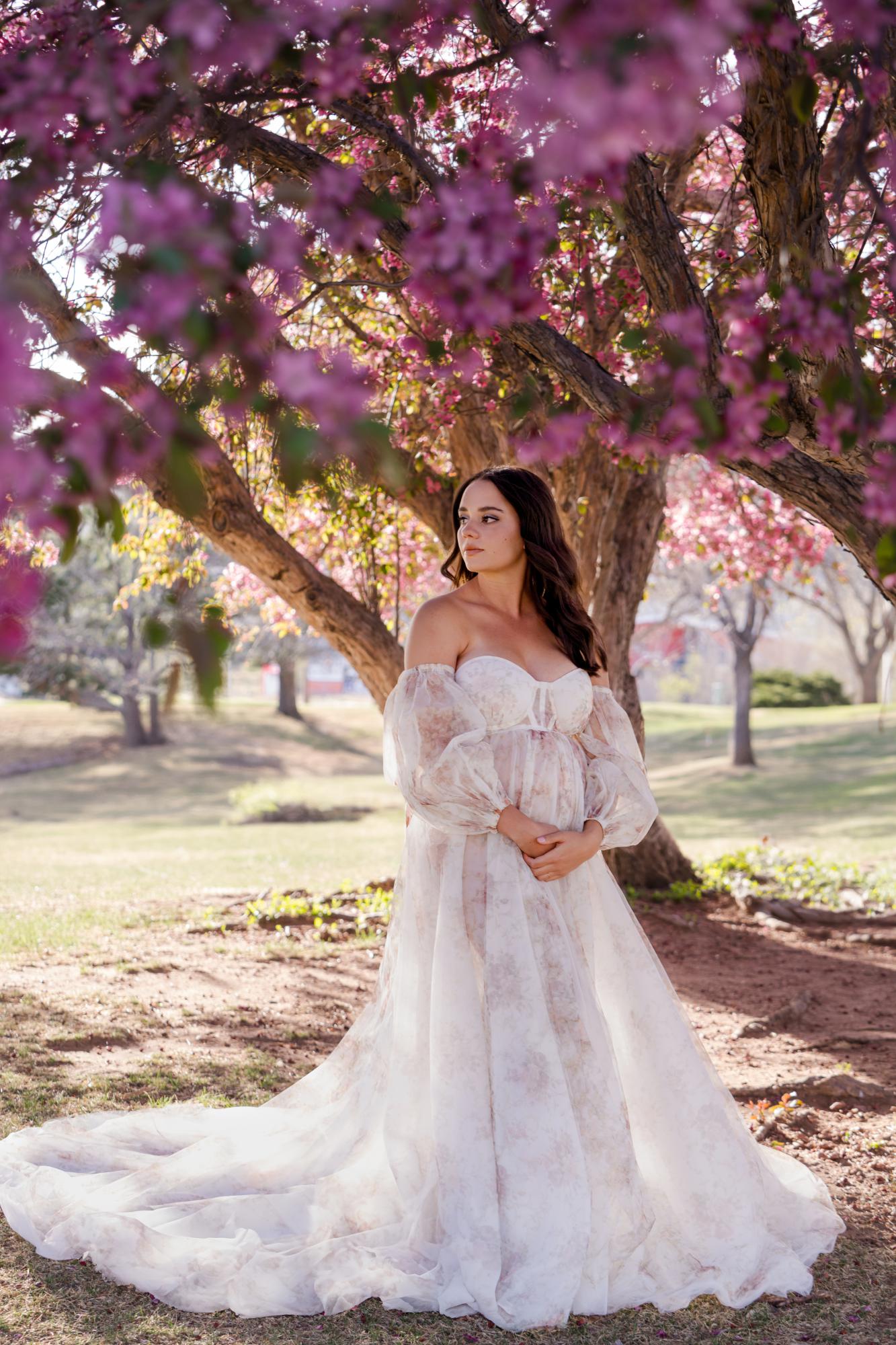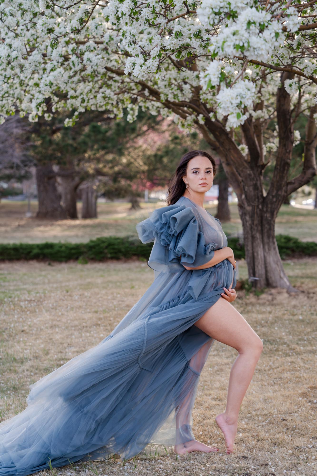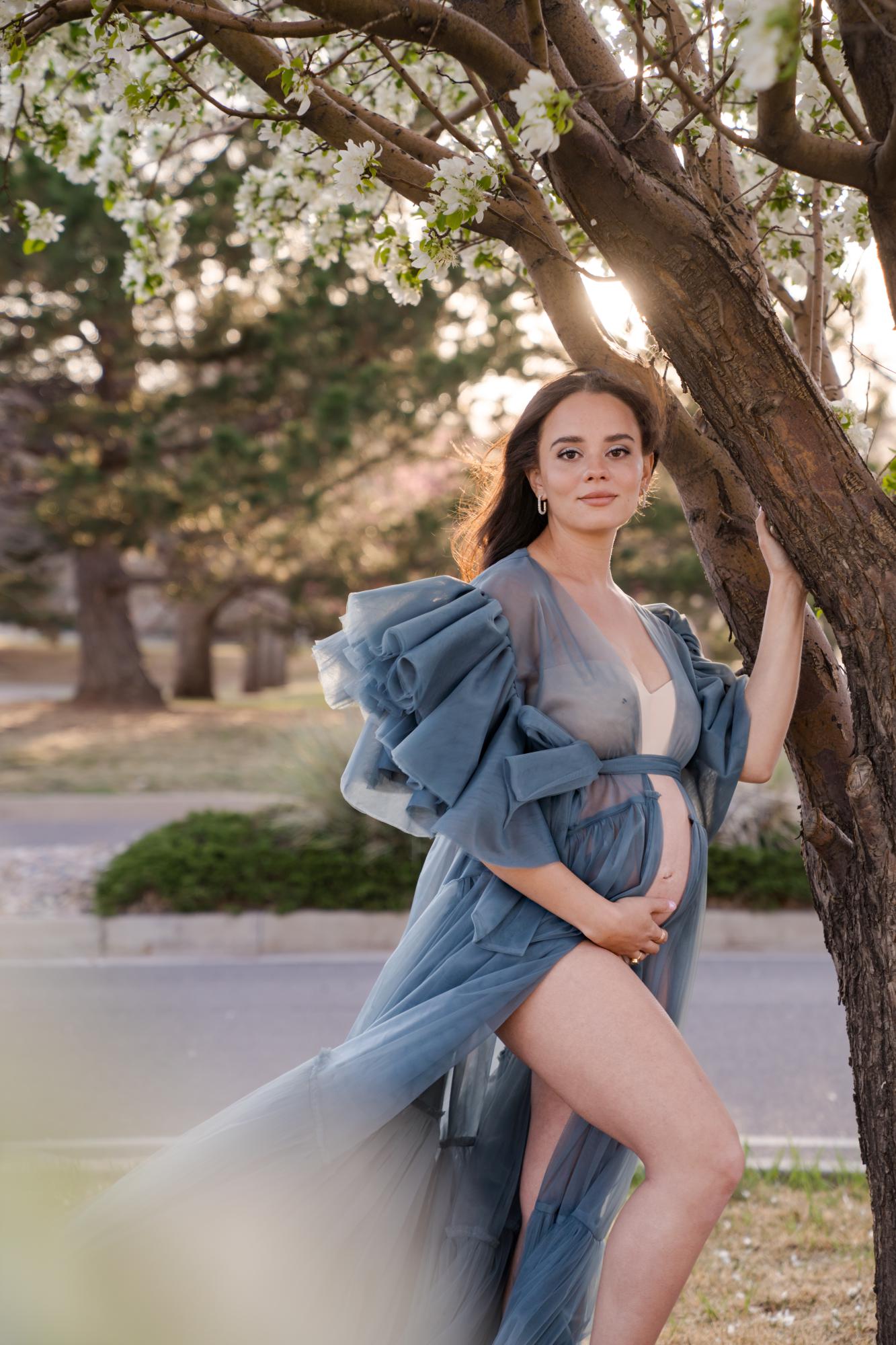 Spring (March–May) is known for delicate blossoms around town. While many people call them cherry blossoms, they are typically crabapple trees in our area. These blooms range from white to soft pink to deeper, vibrant pink tones. They’re usually found in landscaped areas within town rather than growing naturally in the Colorado wilderness. Spring maternity photography in Colorado Springs offers a soft, romantic backdrop with fresh greenery and mild temperatures. The session below is a perfect example of a spring blossom maternity session.
