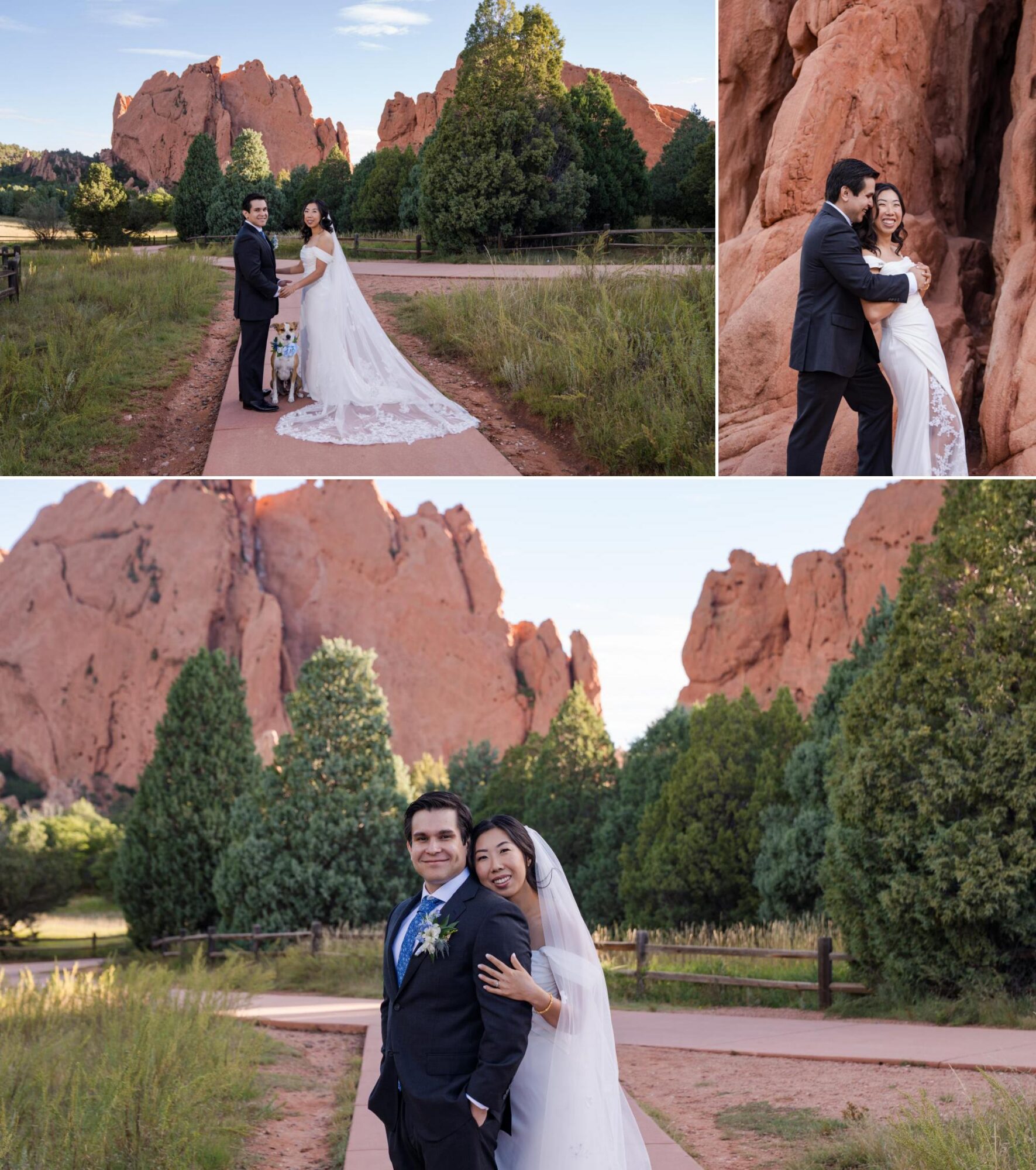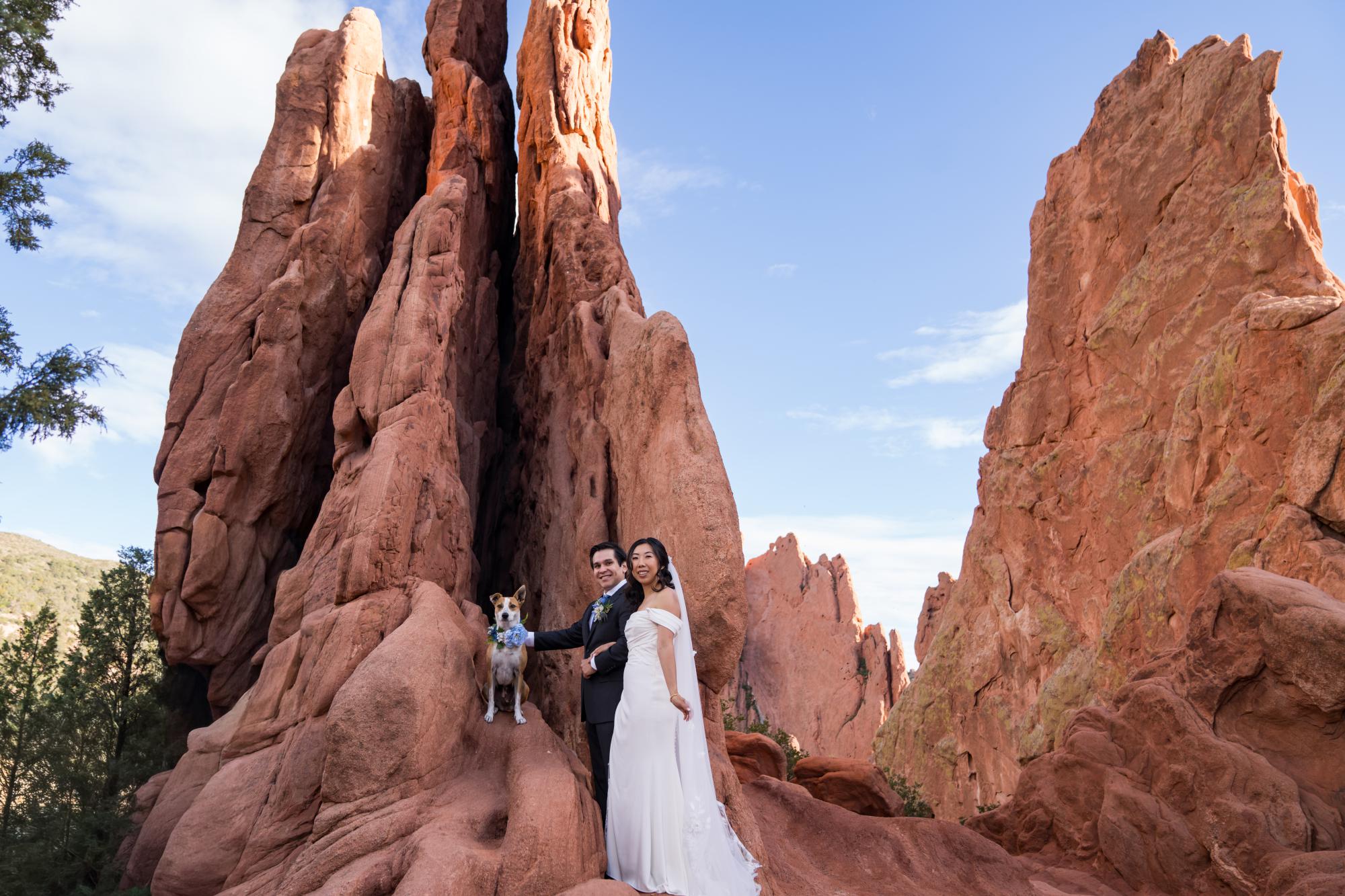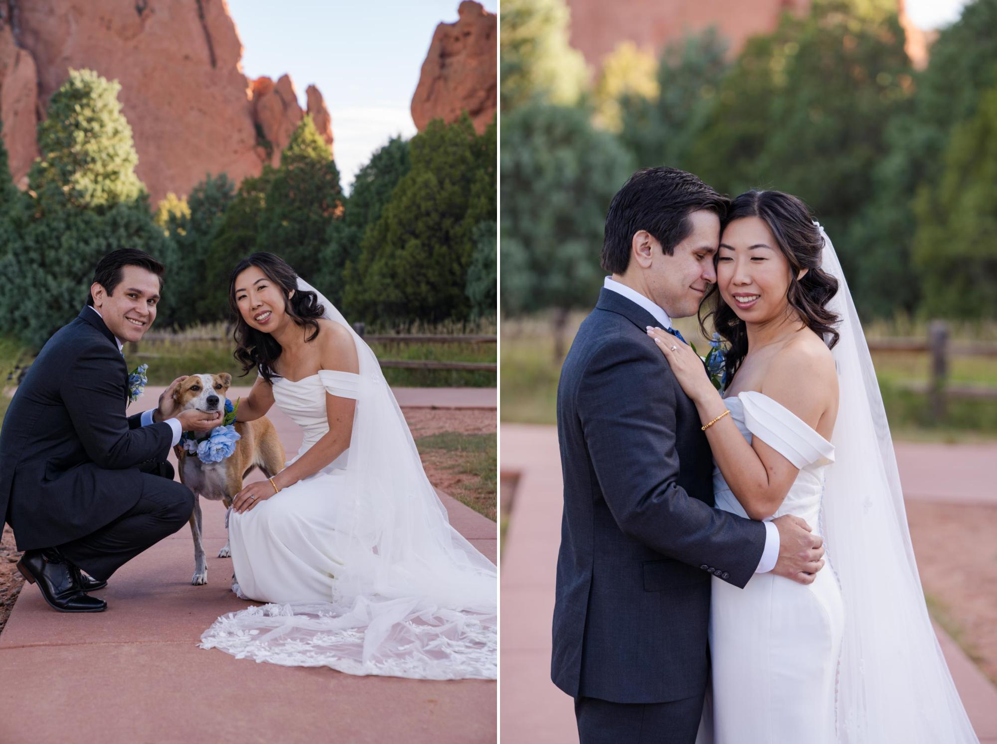 This wedding day was filled with light, movement, and emotion. Getting ready at Garden of the Gods Resort means proximity to the park but also a spa, hair and makeup and fantastic food and desserts. Couples have reimagined their wedding days to fit their vibe and shared love. In this case, love of breakfast and fall weather coupled with an amazing view. The ceremony location overlooked the towering red rocks and reflecting pool. Guests were visibly moved as the couple exchanged vows—not just by the words spoken, but by the scenery surrounding them. Of course, no wedding is complete without all the most important family in your life. In this case, the couples’ furbaby who they could not possibly get married without. Garden of the Gods Resort made sure this guest of honor could RSVP yes.